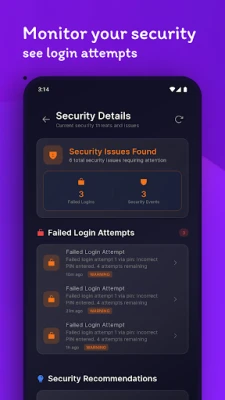 Unlock with your fingerprint or face. Set a PIN as backup. App auto-locks after inactivity, limits failed attempts, and blocks screenshots by default.